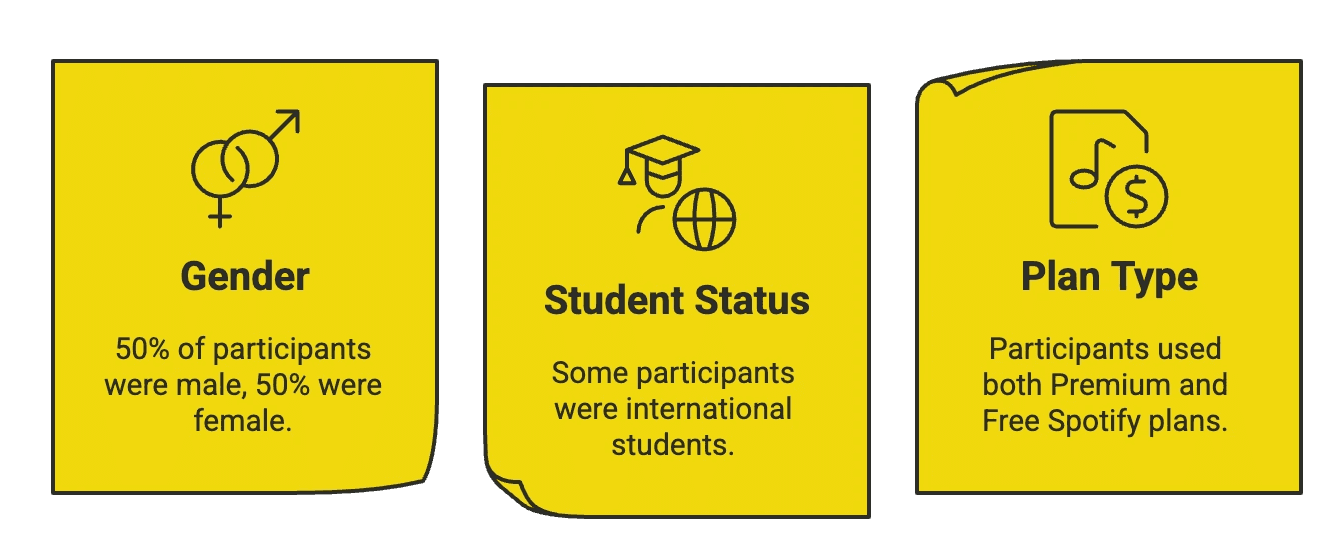 Feedback from students provided valuable insights into how Spotify could enhance its music discovery feature to better reflect diverse preferences. Participants had between 3-11 years of Spotify usage, across devices like smartphones, tablets, and computers.