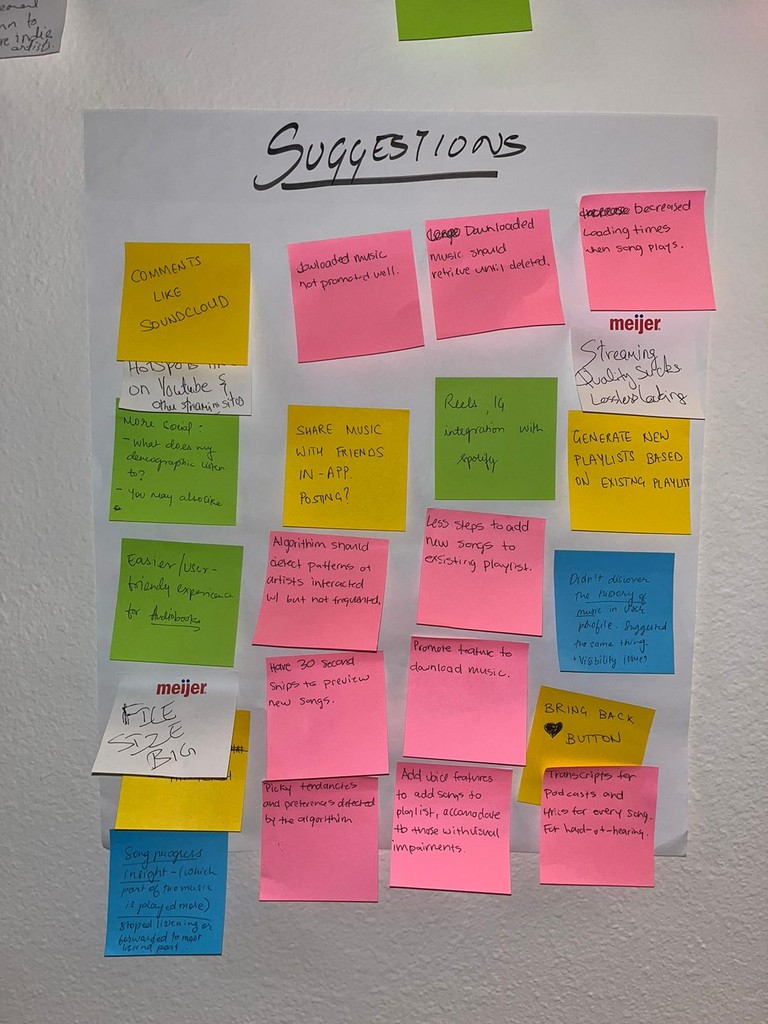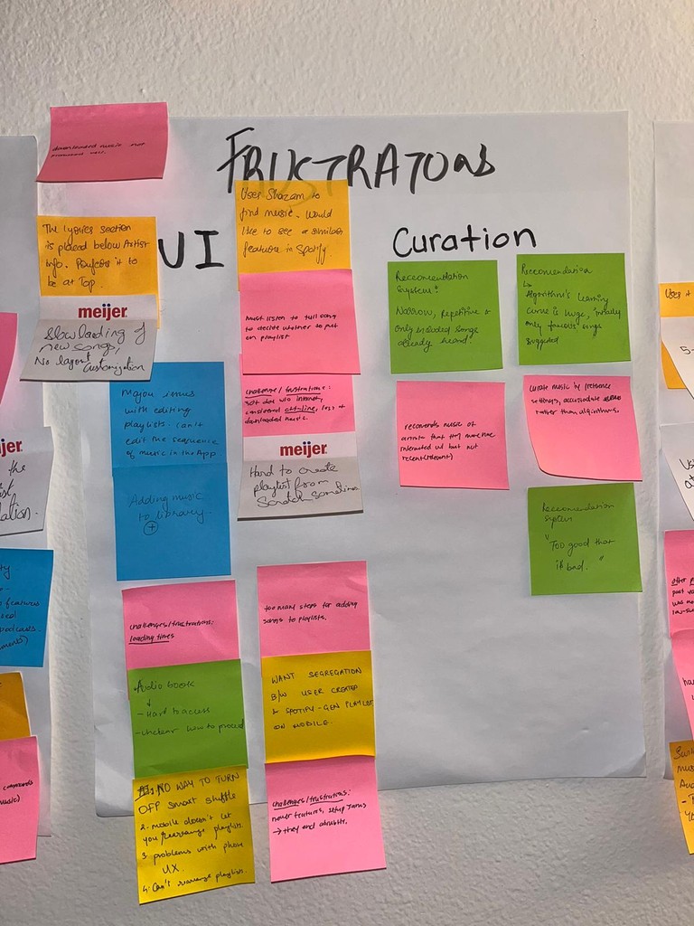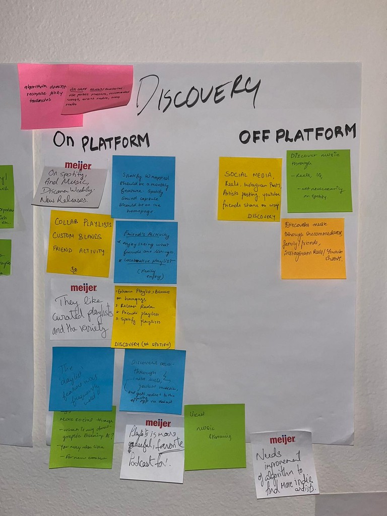 Through affinity mapping of interview responses, we identified key frustrations: users often discovered music outside of Spotify, faced tedious playlist organization, and found social features underutilized.
